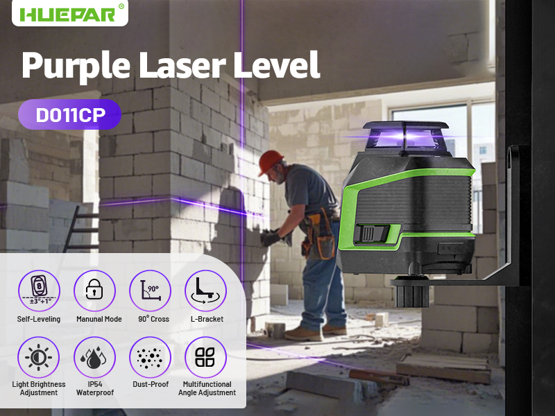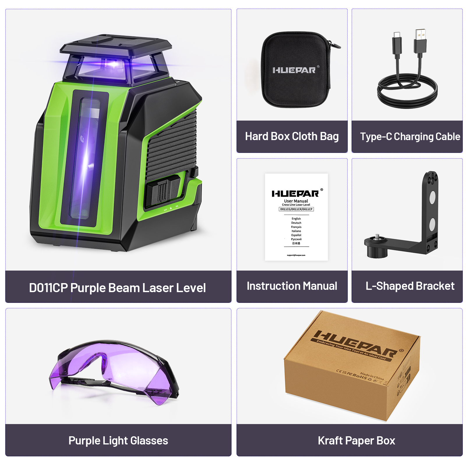 Fascicul laser violet distinctiv: Nivela laser Huepar D011CP dispune de un fascicul laser violet unic, care oferă vizibilitate îmbunătățită în diverse condiții de iluminare. Lungimea sa de undă distinctivă iese în evidență la interior și în exterior. În plus, este ideal pentru utilizatorii cu daltonism roșu-verde. O soluție cu adevărat incluzivă pentru măsurători precise și eficiente.