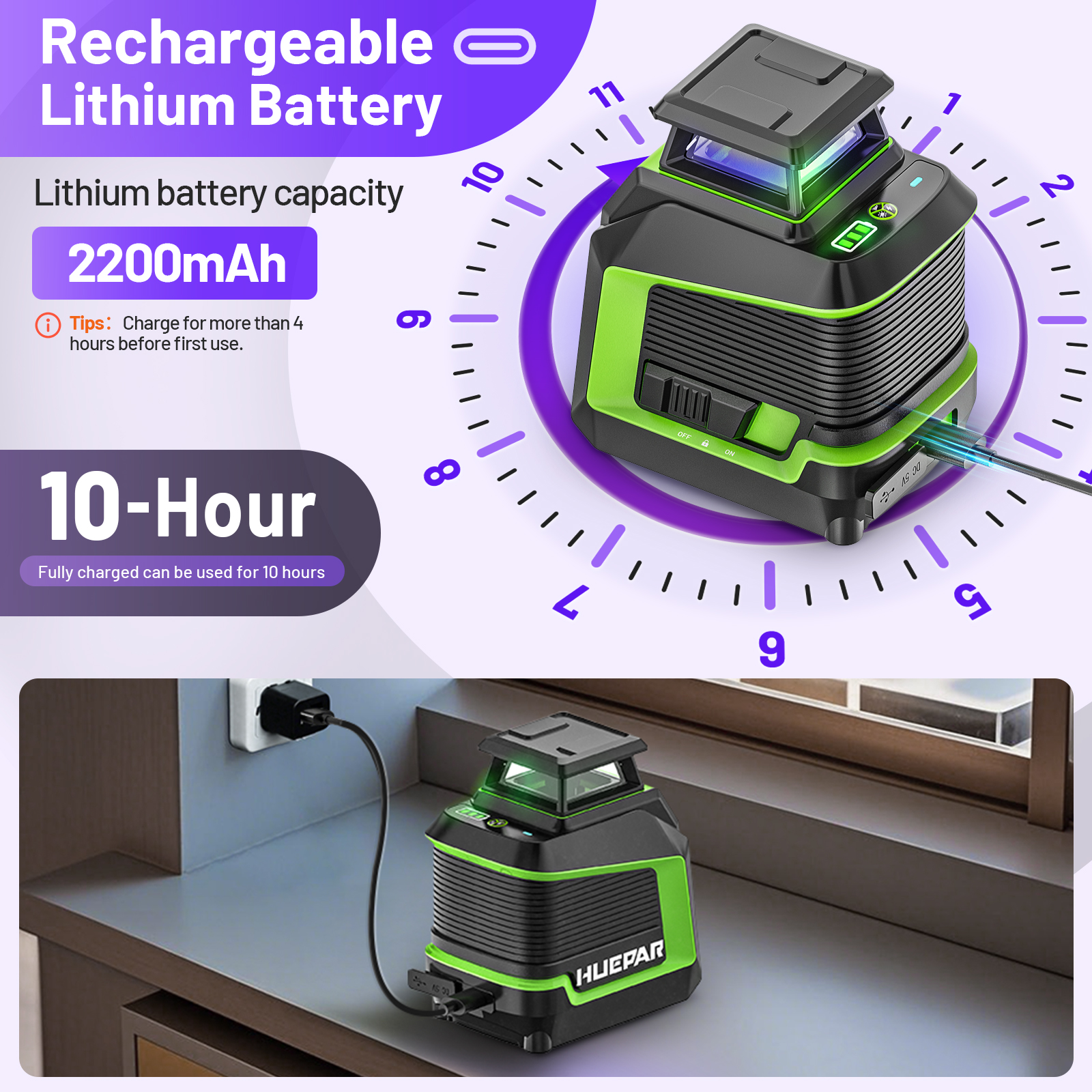 Autonivelare precisă cu moduri de lucru duale: Oferă o precizie de 3mm la 10m și se autonivelează automat pentru o trasare precisă. Acceptă atât modurile manuale, cât și cele pulsate: modul standard acoperă până la 25 m, în timp ce modul pulsat extinde raza de acțiune până la 50 m, fiind potrivit și pentru utilizare în exterior cu un receptor laser Huepar LR-6RG, LR-8RG.