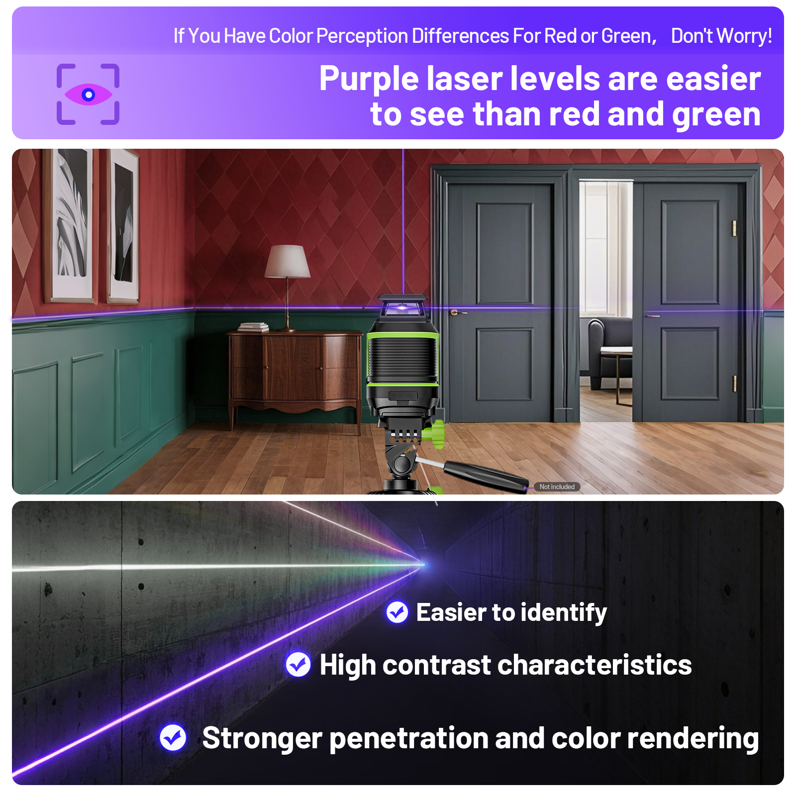Linii laser orizontale la 360° și verticale la 130° cu acoperire completă: Proiectează linii orizontale ultra-largi la 360° și verticale la 130° pentru o acoperire completă – perfect pentru alinierea tavanelor, podelelor și pereților. Ideal pentru construcții, remodelare și lucrări DIY care necesită o amplasare de înaltă precizie.